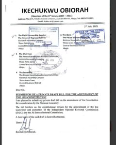 Obiorah, who represented Anambra South Senatorial District from 2007 to 2011, revealed this in a treatise titled “The Philosophy of Elections and Nigeria’s Fake Democracy,” made available to journalists in Abuja over the weekend. He officially transmitted the draft bill to both the Senate and the House of Representatives on August 8.