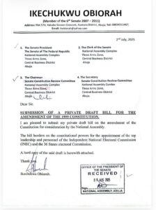 Former Senator and legal practitioner, Ikechukwu Obiorah, has submitted a draft constitutional amendment bill to the National Assembly seeking to strip the President and State Governors of their powers to appoint members of the Independent National Electoral Commission (INEC) and State Independent Electoral Commissions (SIECs).
