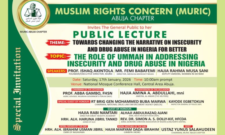 The Muslim Rights Concern (MURIC), Abuja Chapter, is set to convene a high-level public lecture bringing together key religious leaders, security chiefs and community stakeholders to address the growing challenges of insecurity and drug abuse in Nigeria.