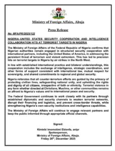 The statement emphasised that Nigeria’s counter-terrorism operations remain guided by the protection of civilian lives and the preservation of national unity, stressing that terrorist attacks against any community—Christian, Muslim, or others—are unacceptable and contrary to Nigeria’s values.